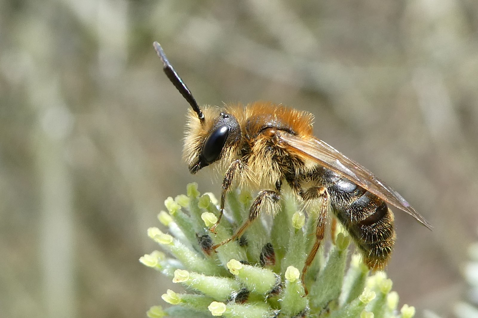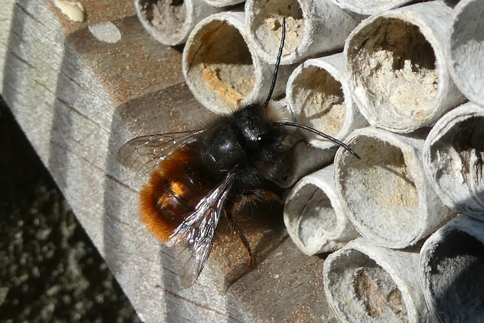 Ook is het Bijentelweekend en geeft Marcel Mutsaers uitleg over de insecten. Als het zonnetje schijnt zijn er in de Naturentuin naast de honingbijen verschillende wilde bijen en zweefvliegen te vinden. Jong en oud zijn welkom. Er zijn bijengidsjes aanwezig. Hierboven 2 foto’s van Marcel: Gehoornde metselbij en Roodgatje.